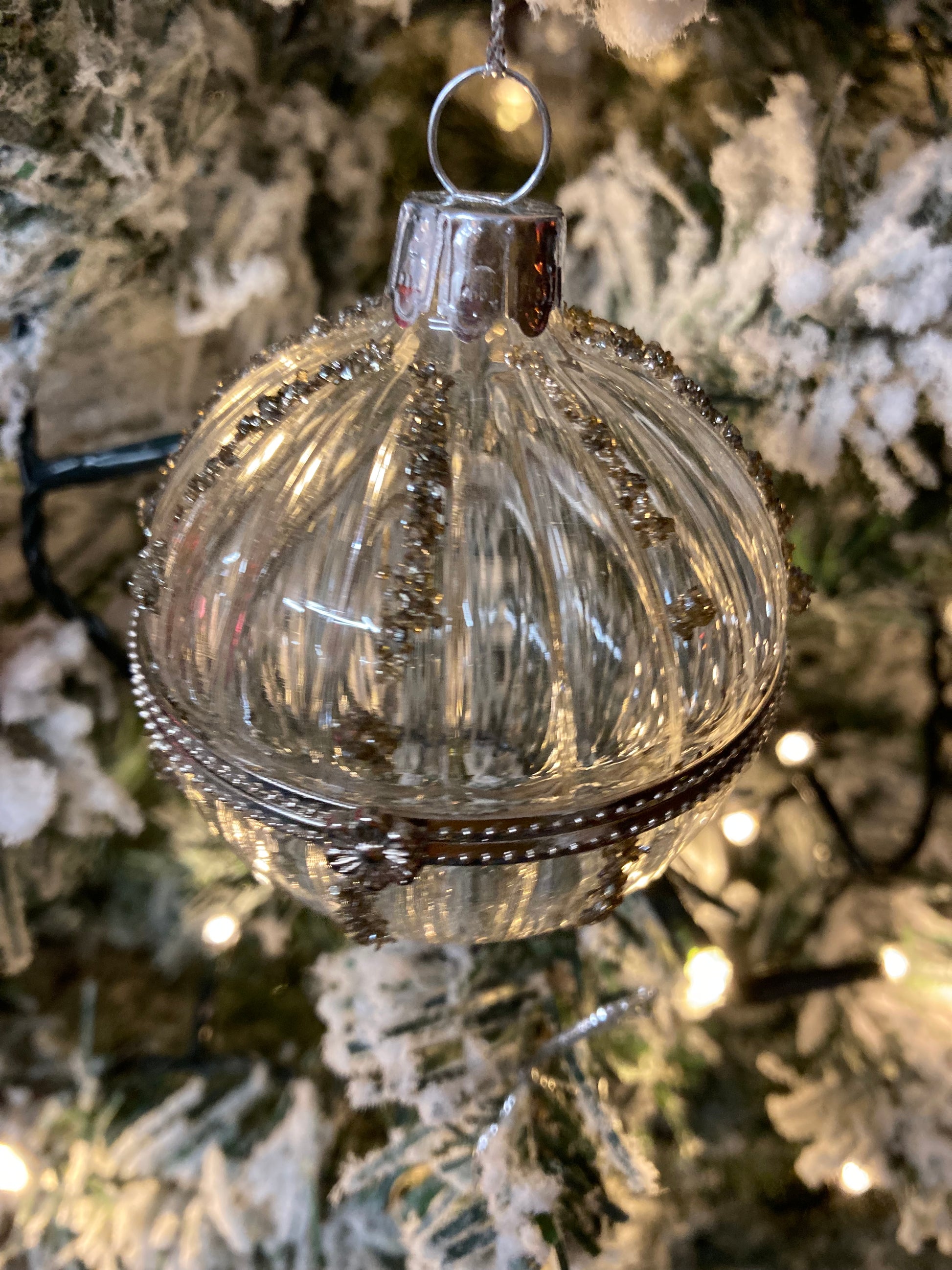 A gorgeous glass bauble decorated with silver glitter. The bauble has a bow detail and opens to be able to fill with a small gift.