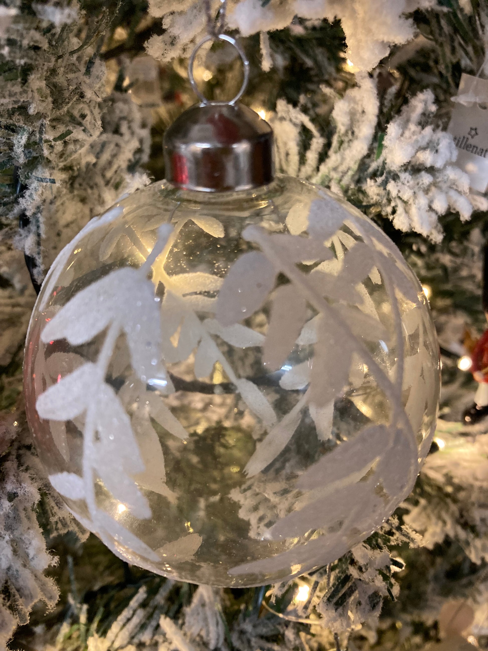 Glass bauble with white leaf detail.