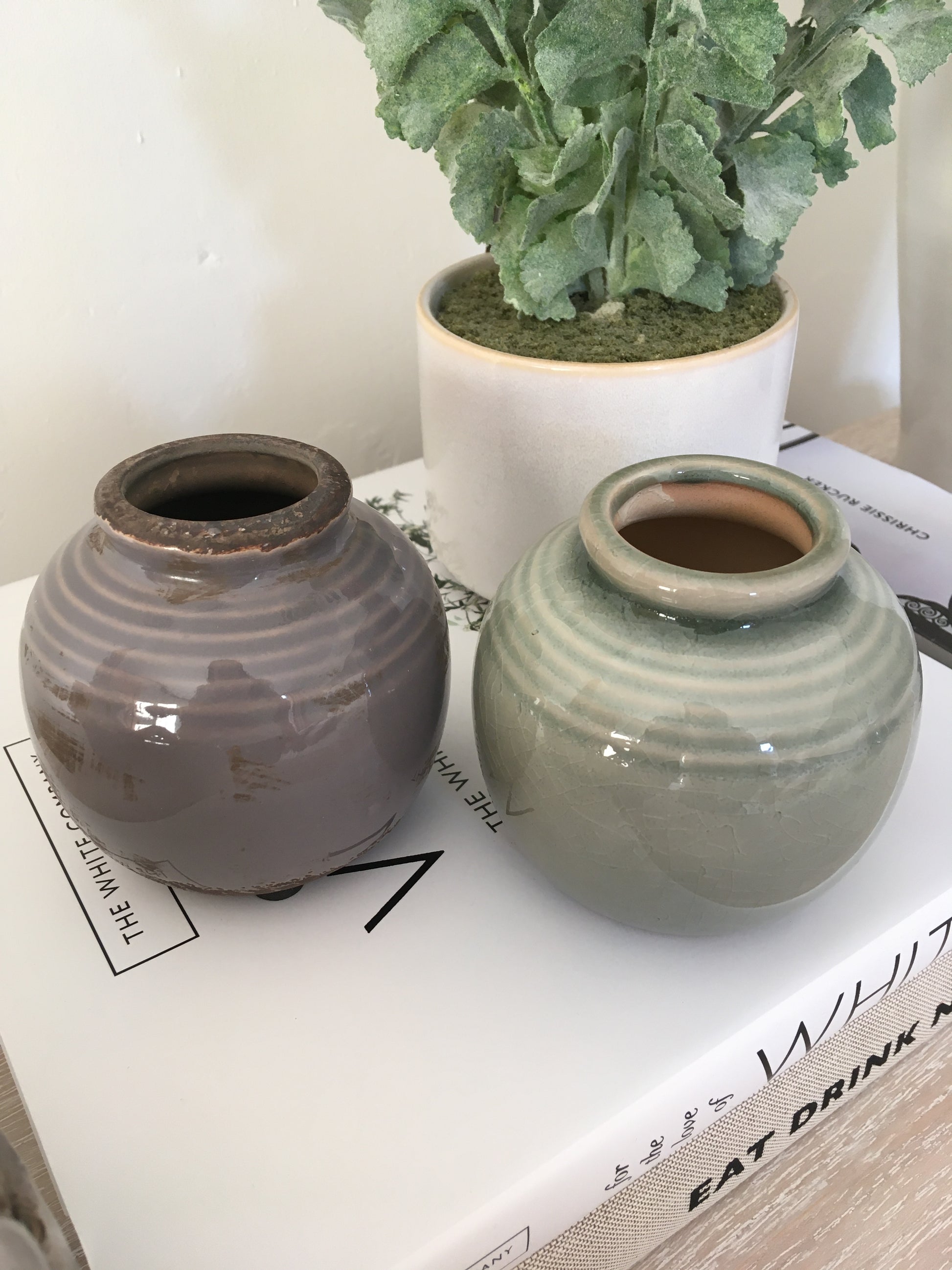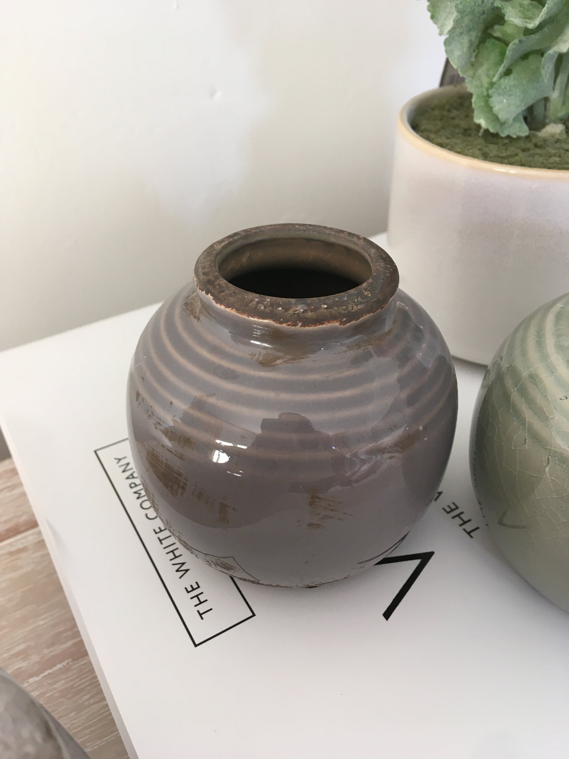 A small, cute pot with a crackle and distressed effect. It has a glazed finish to give it a beautiful sheen. This can be a decorative piece on its own or filled with a small bunch of flowers.