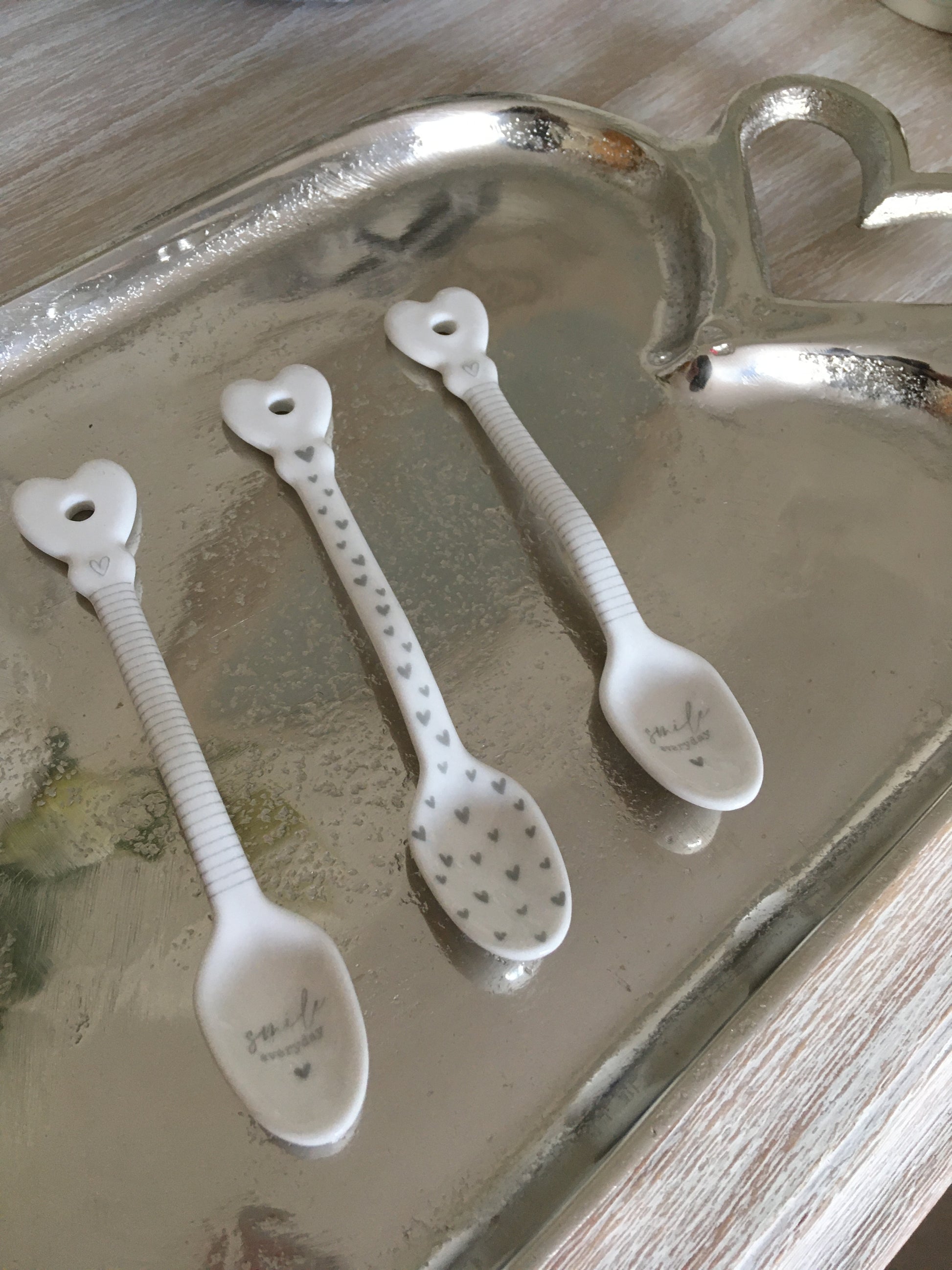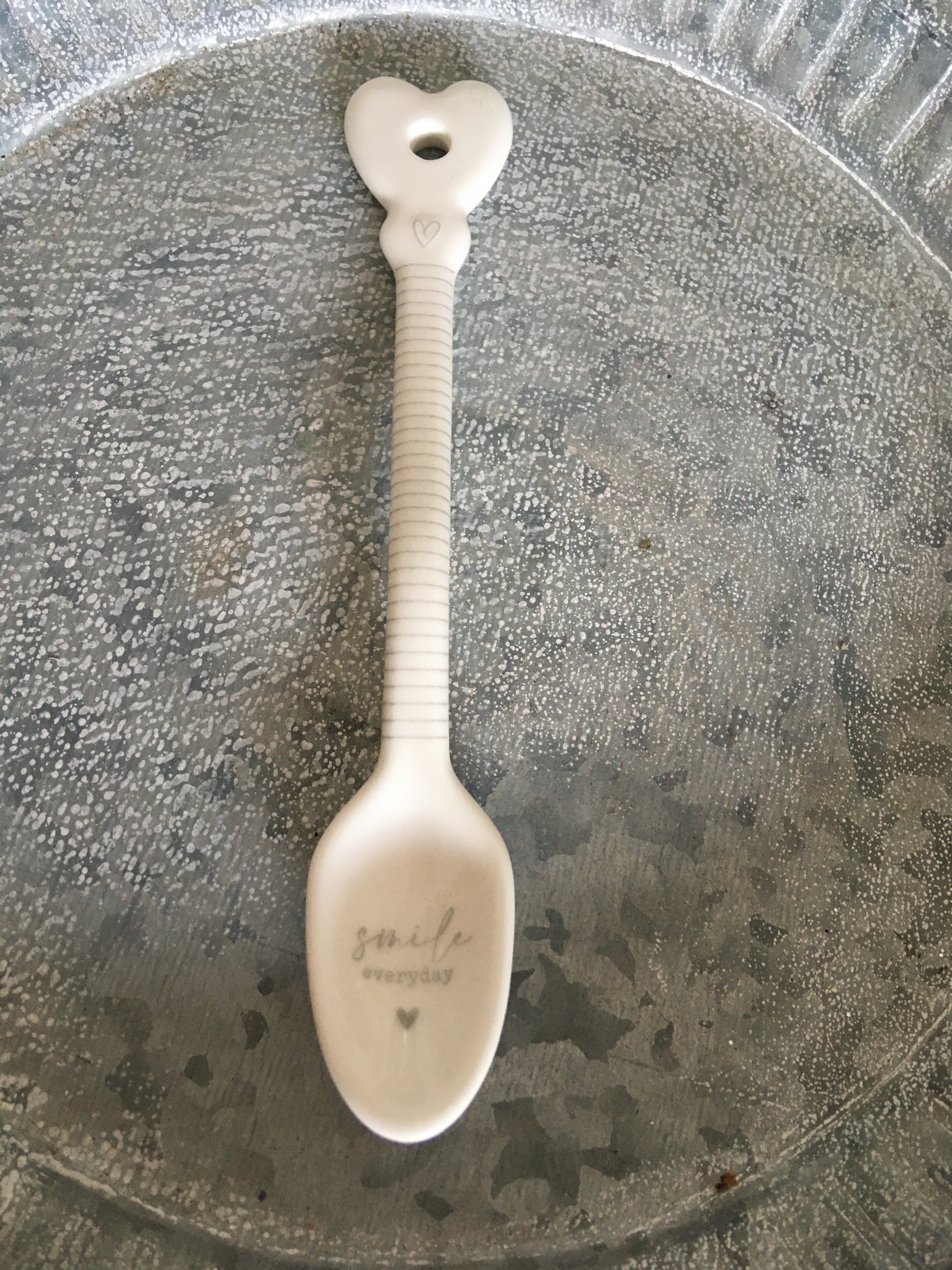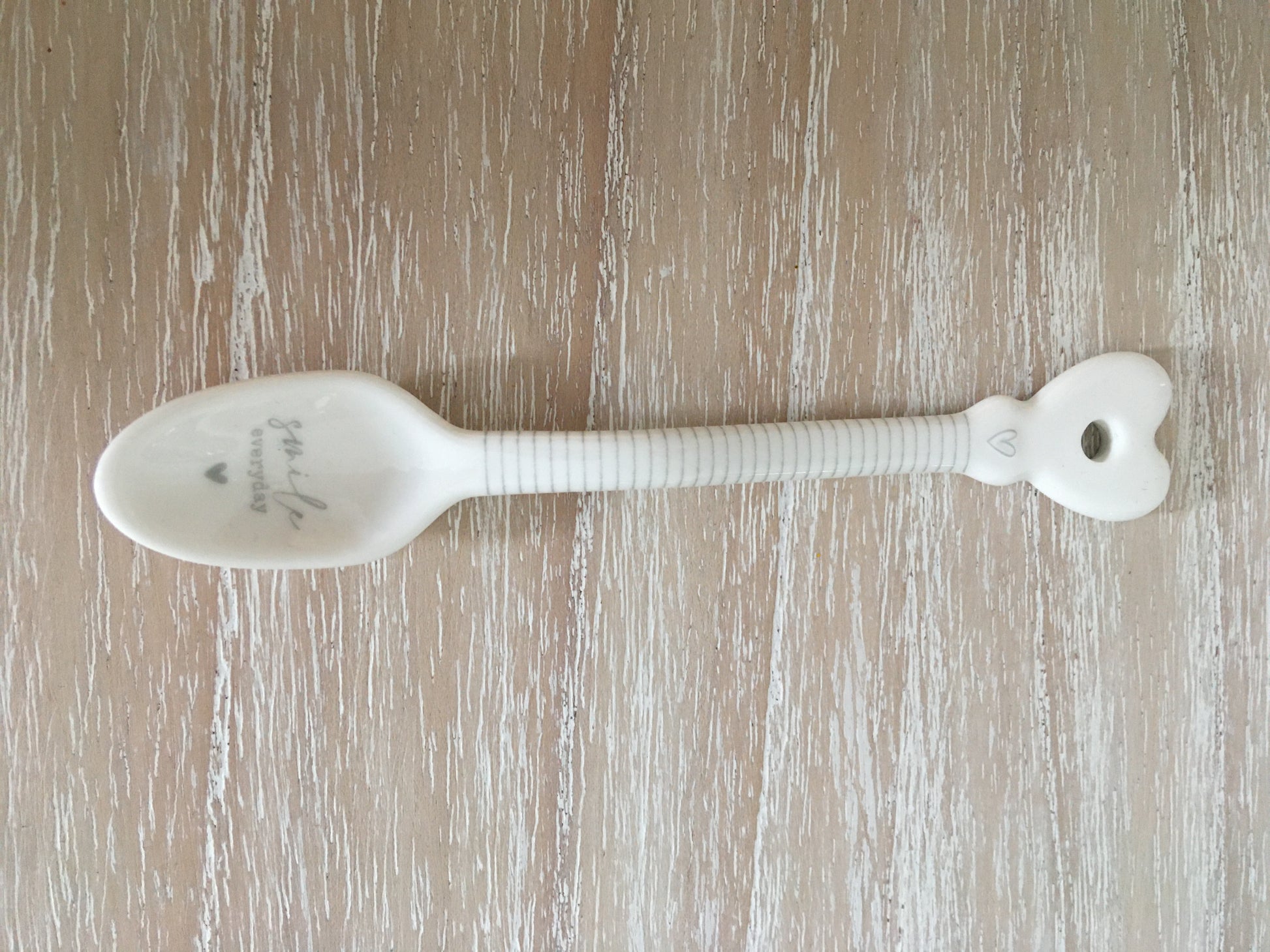 A white china spoon with grey 'Smile Everyday' wording, stripe effect and a heart shape edge.