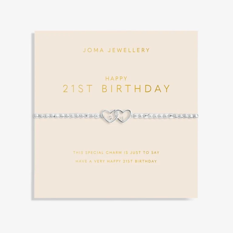 Our Joma A Little 21st Birthday bracelet is made to be treasured for a lifetime. It features a silver-plated design with a sparkling heart-shaped charm. Complete with a pretty blush pink card which has been stamped with the sentiment 'Happy 21st Birthday' and a sweet poem.