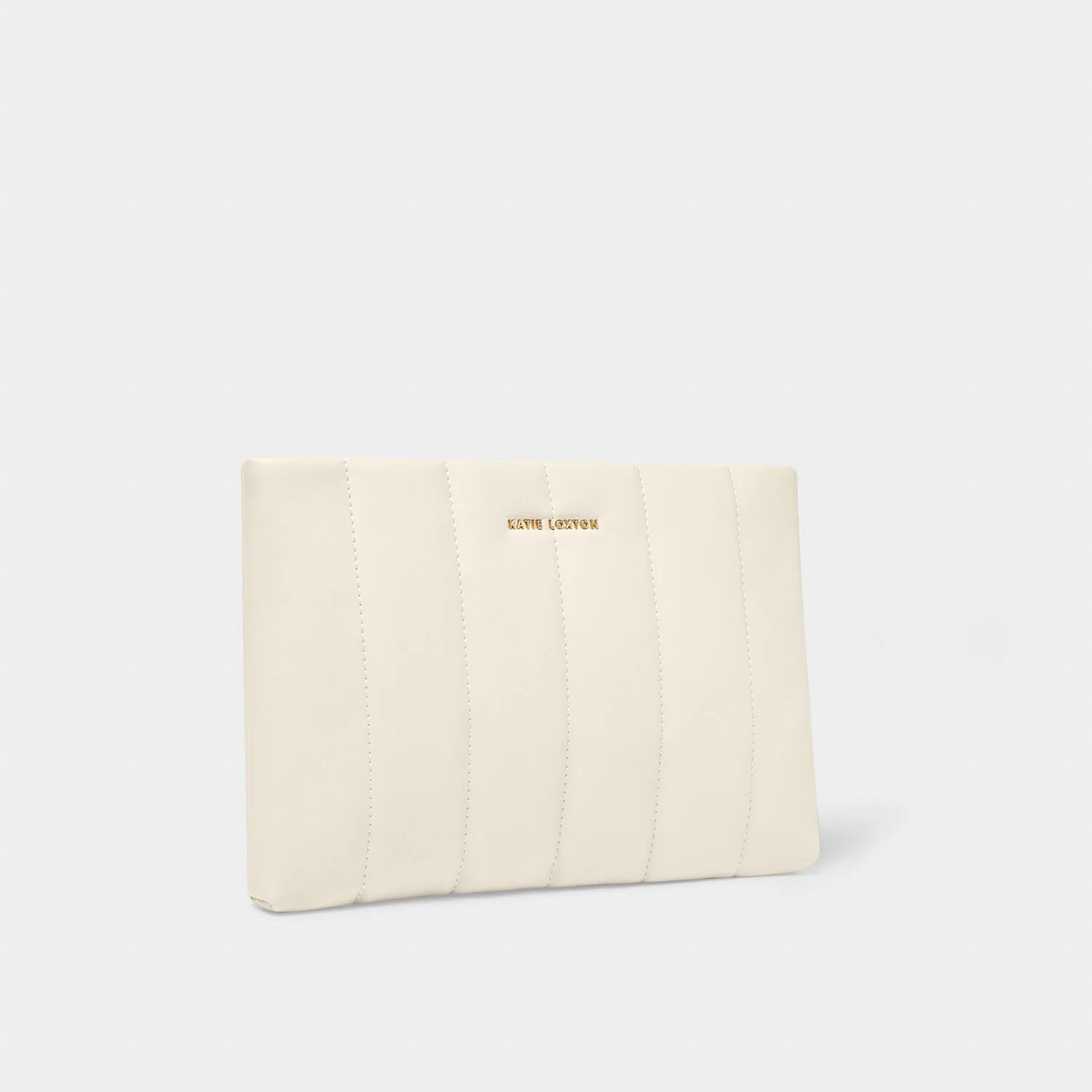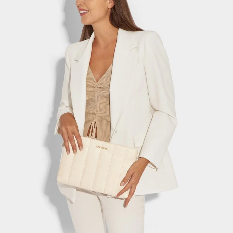 Our beautiful oyster coloured Katie Loxton Kendra Quilted Clutch features a soft vegan leather material in the shade dusty coral, complete with a quilted stripe pattern and our signature gold-tone hardware.