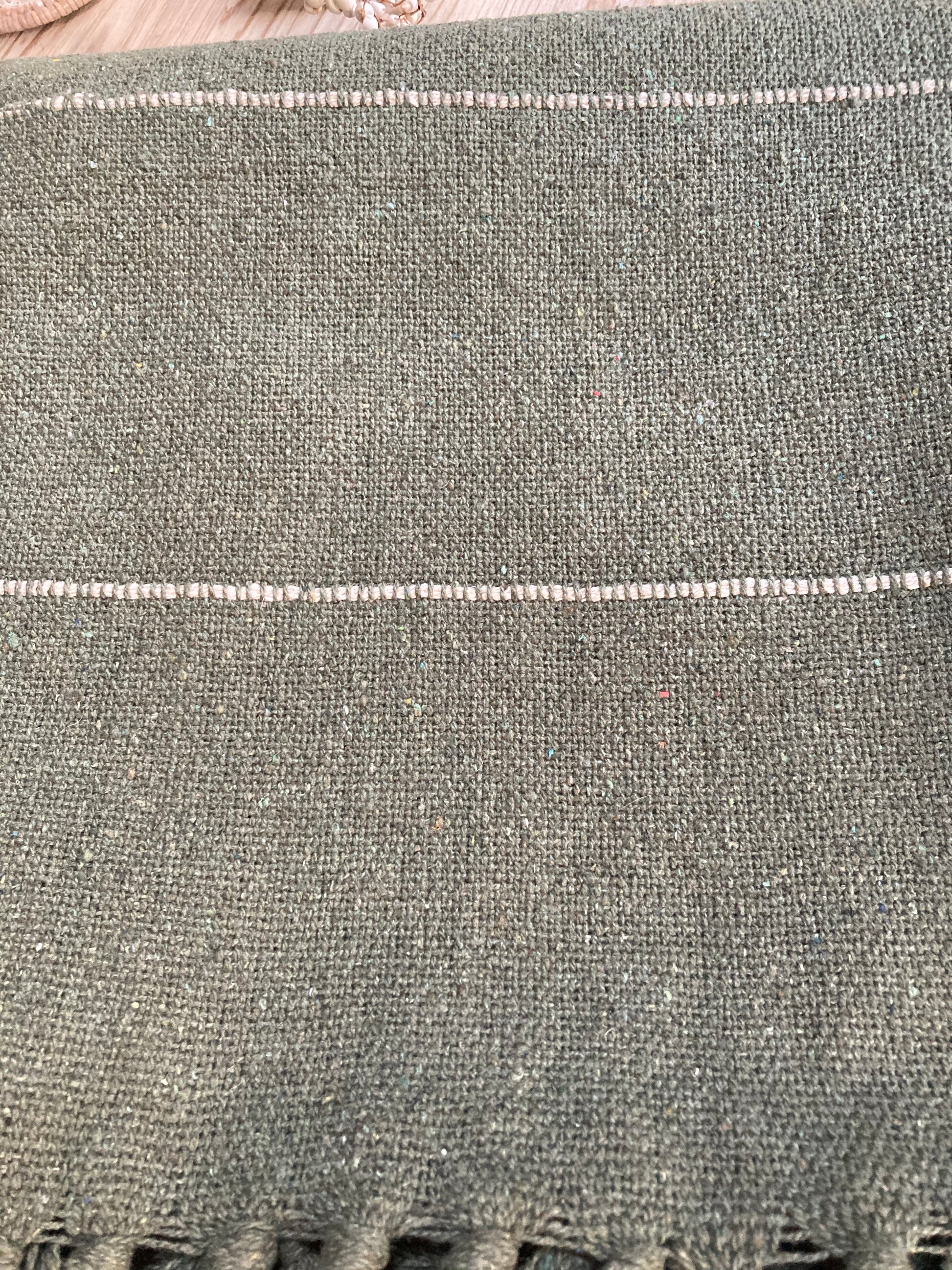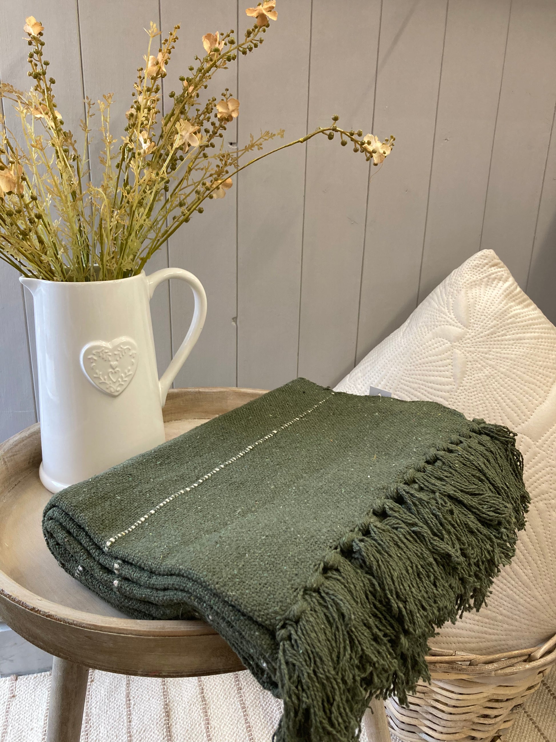 An olive throw with fringe edging and white stripe. A decorative item for your home or can be used to keep you cosy during the colder evenings.