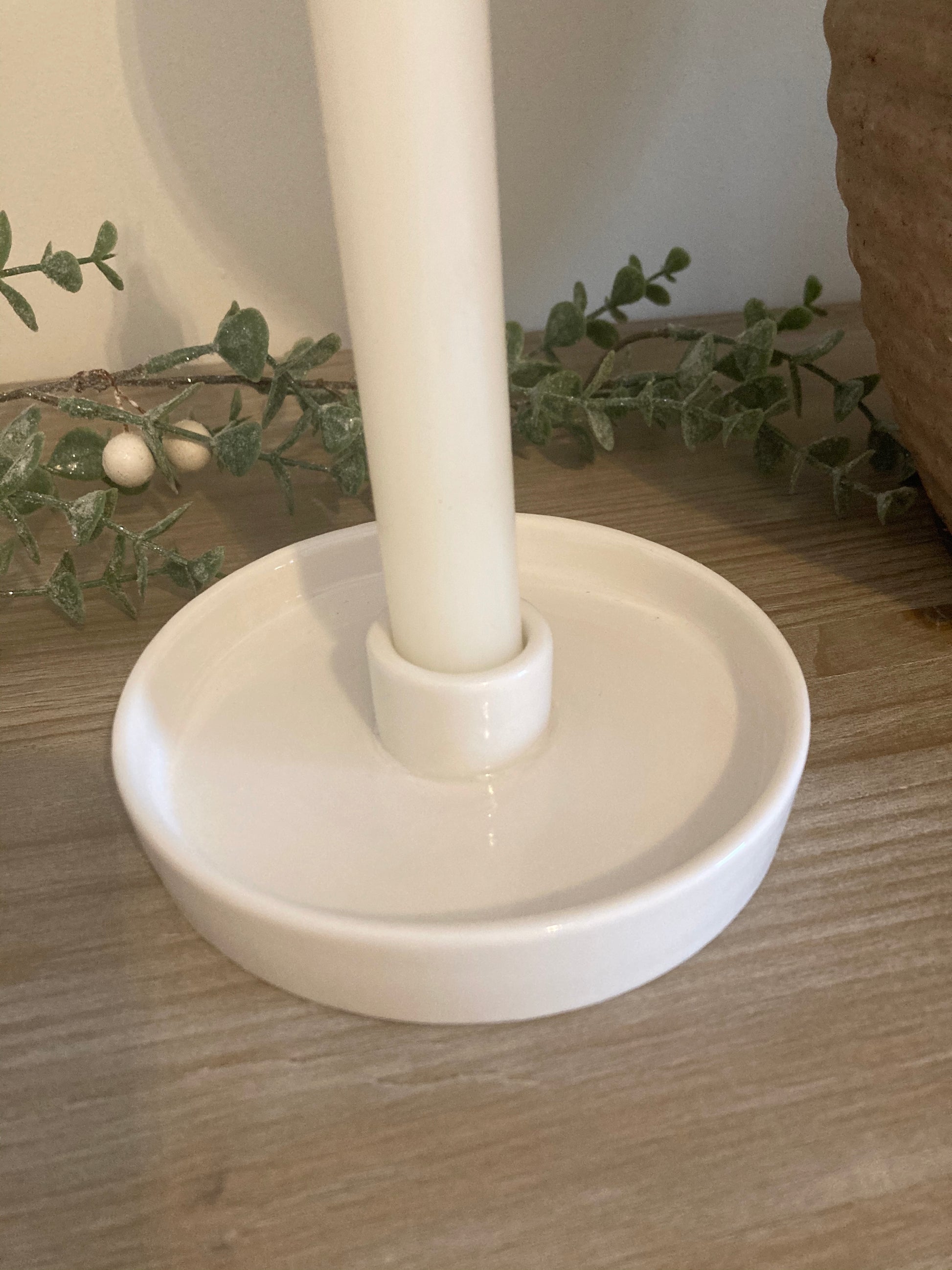 A white, round candle holder. A timeless design, suitable for modern and more traditional homes.