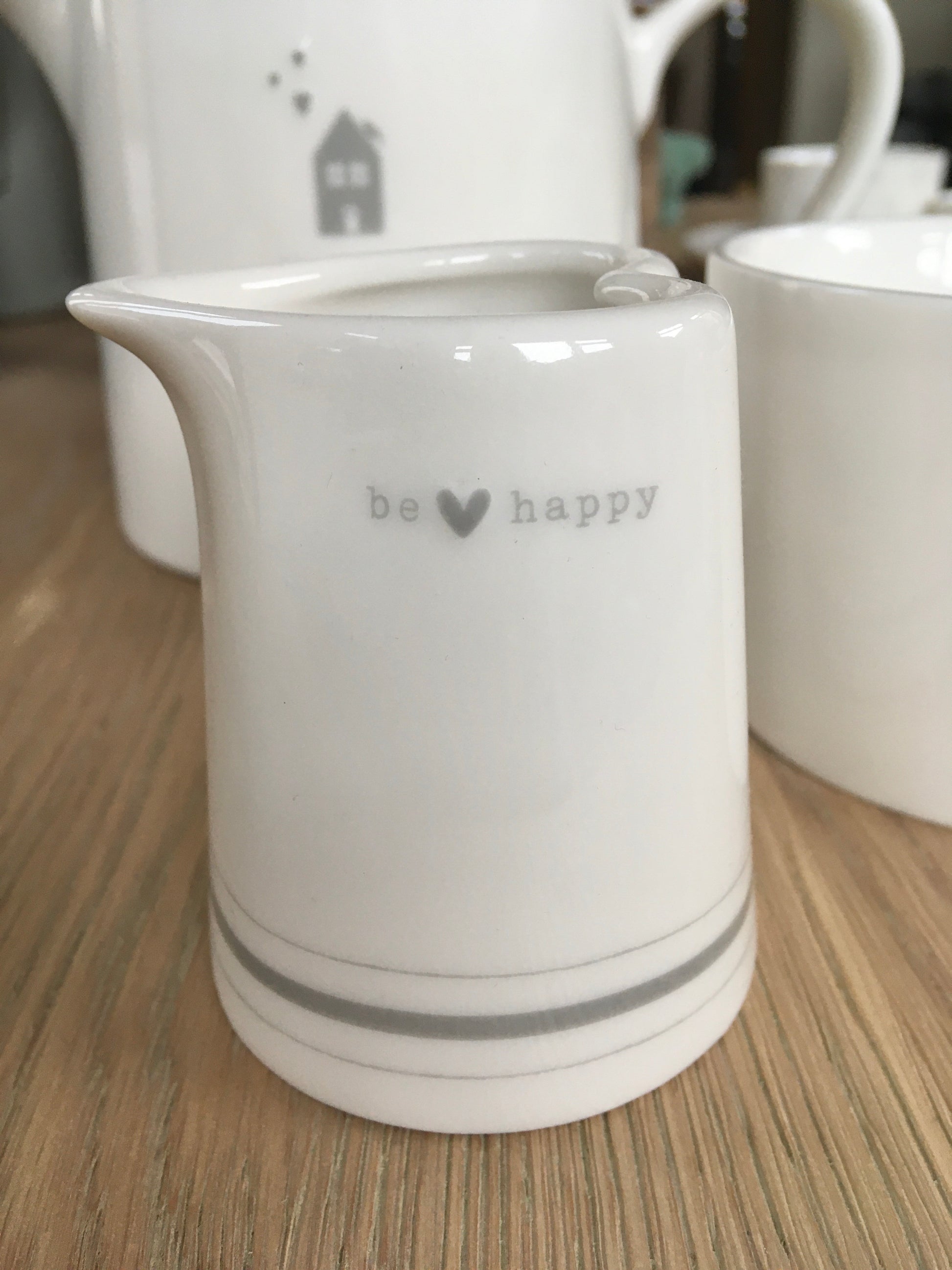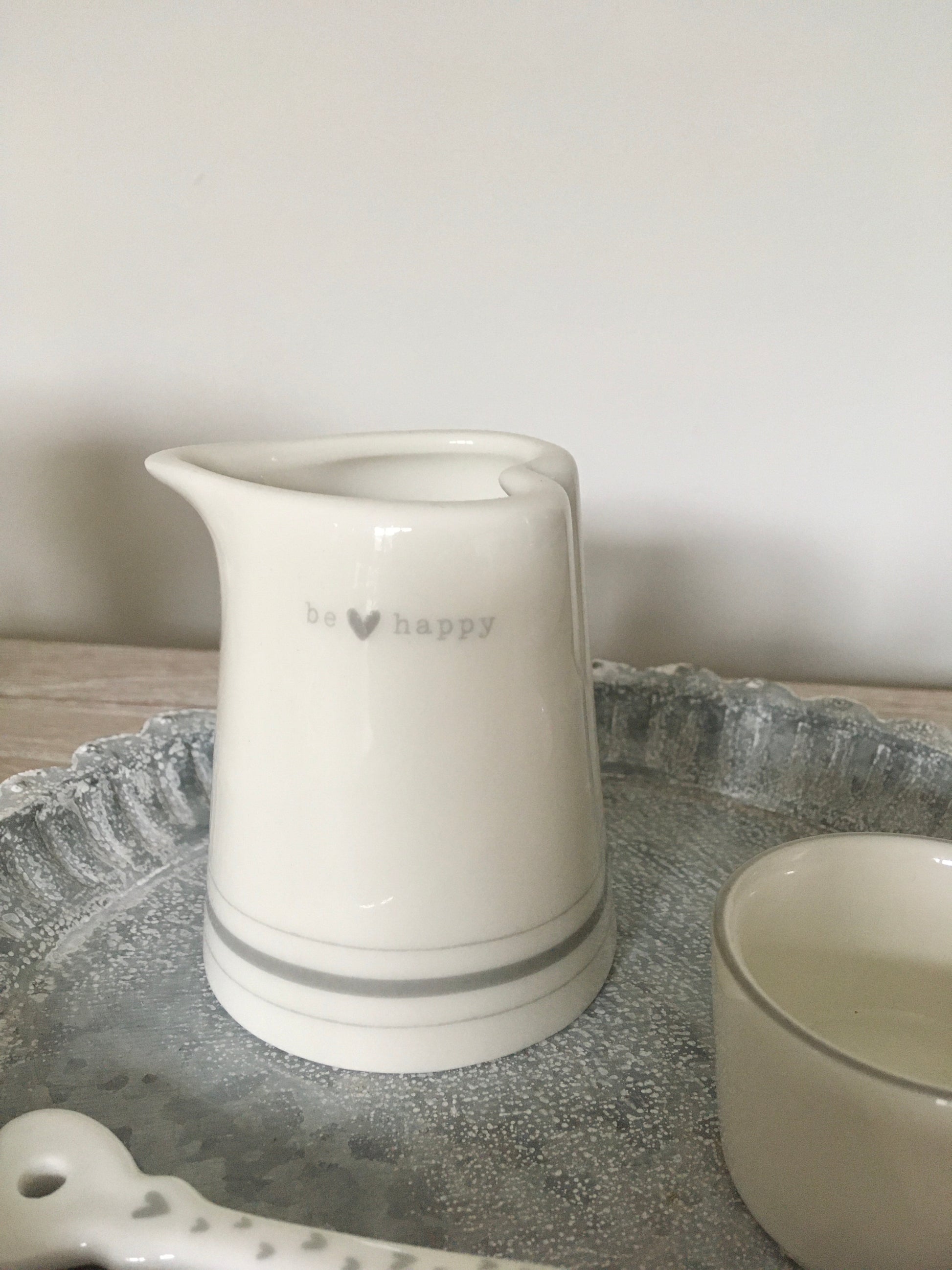 A beautiful white china jug with heart detail and 'Be Happy' wording. A small jug ideal for using to pour milk.