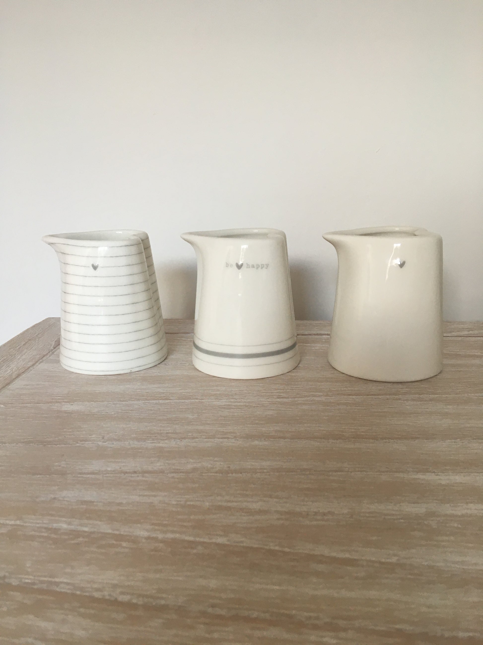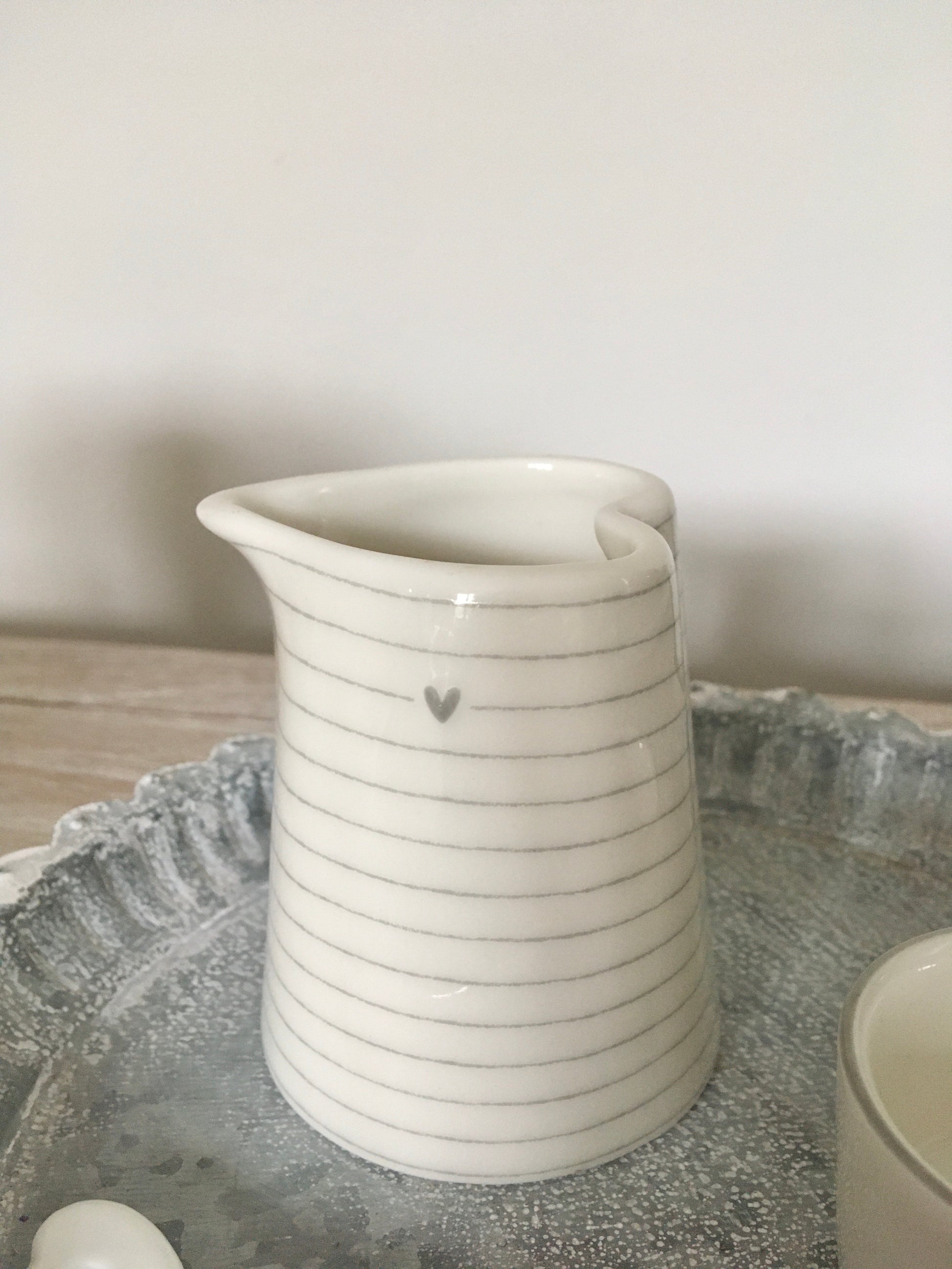 A beautiful white china jug with heart and grey stripe detail. A small jug ideal for using to pour milk.