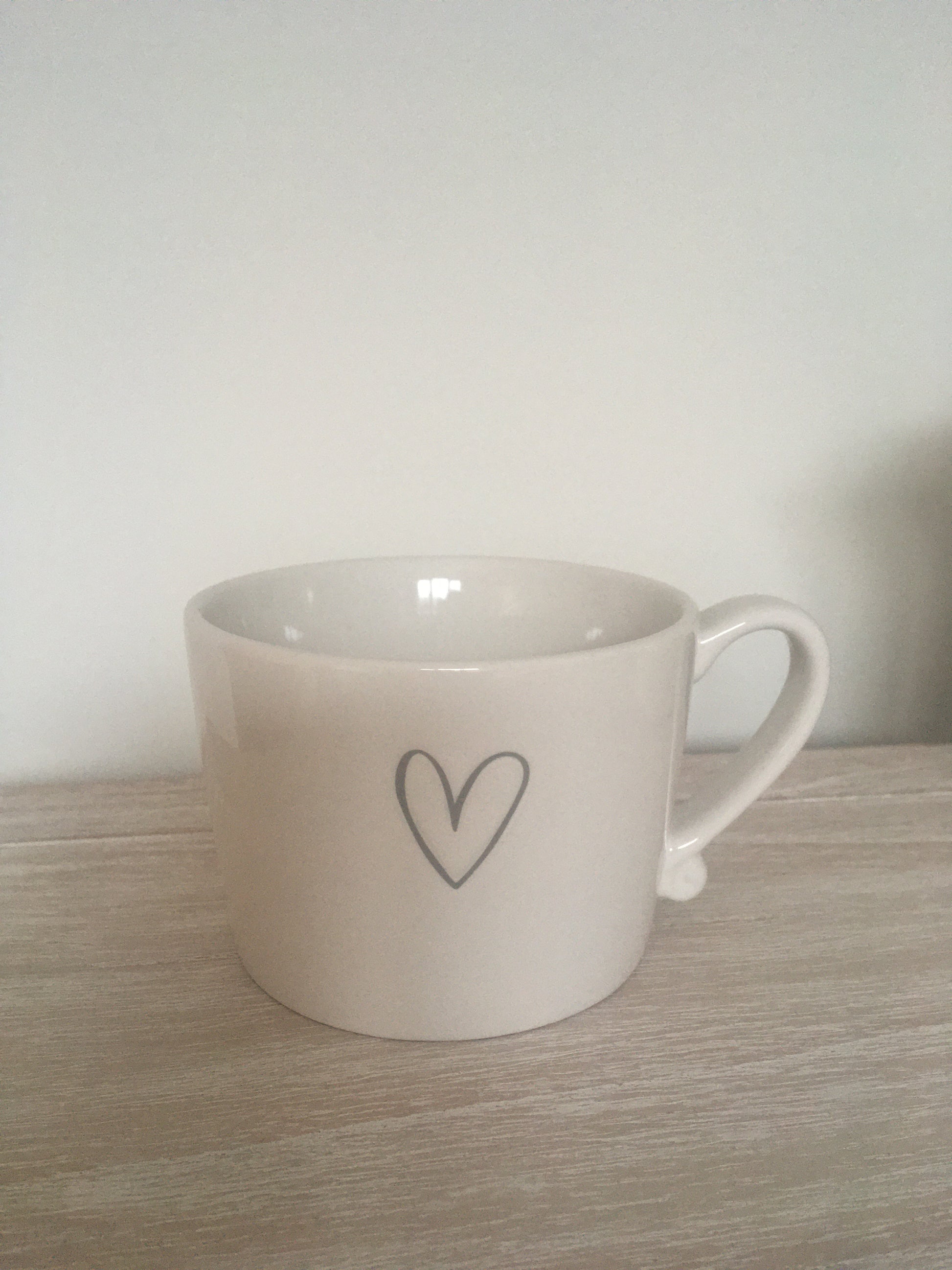 A beautiful white china mug with grey heart detail. Perfect for your morning cuppa.
